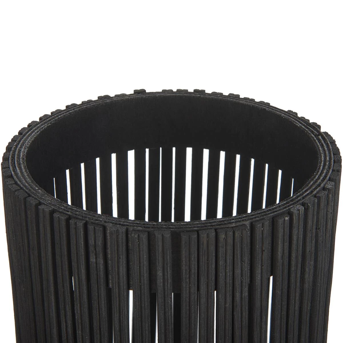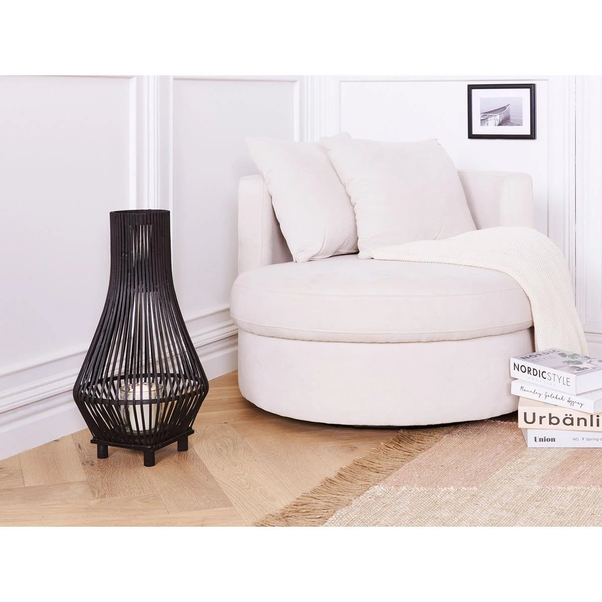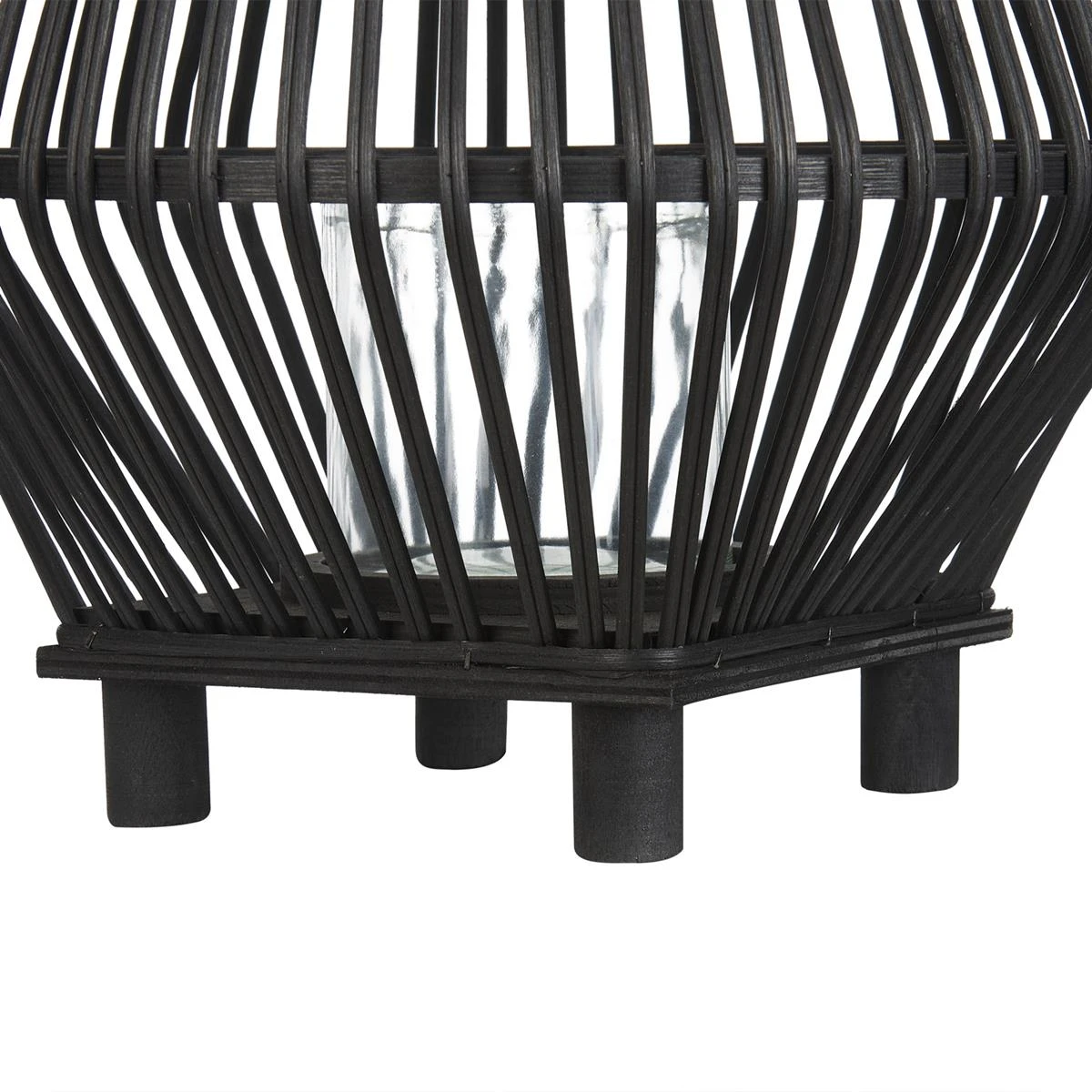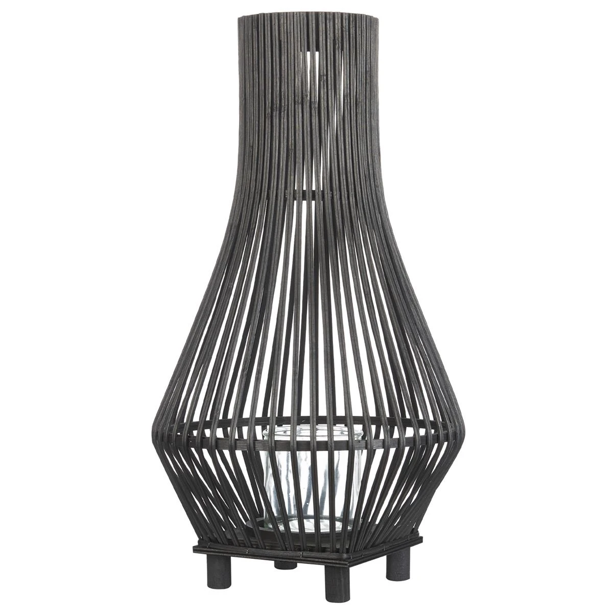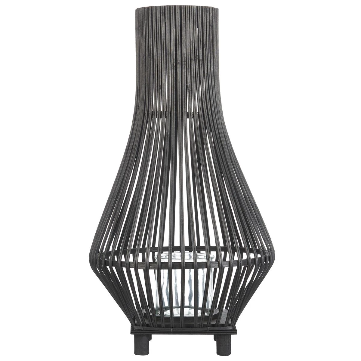 Deze hoge vloerlantaarn van bamboe straalt rustieke charme uit met haar ingewikkelde weefpatronen. Het ontwerp heeft slanke poten die een sierlijk silhouet ondersteunen. Het glazen inzetstuk zorgt ervoor dat de warme gloed van het licht binnenin doo